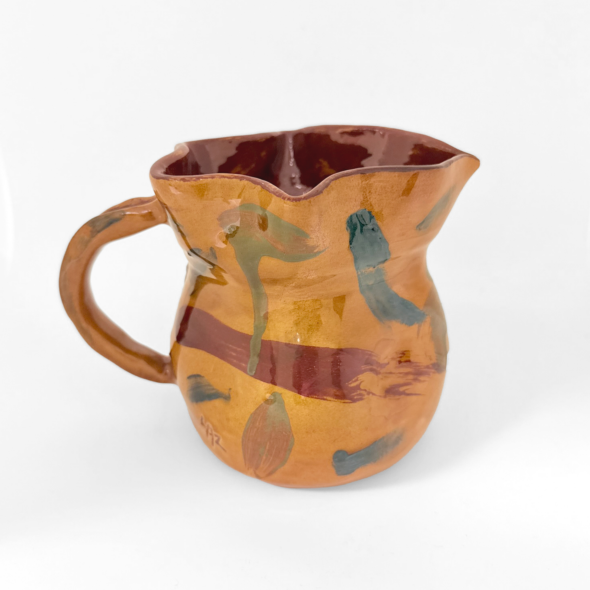 Jarra de mesa tradicional en barro rojo decorada con engobes en tonos ocre, teja y verdes que nos conectan directamente con la tierra, con la naturaleza. Su forma favorece una perfecta aireación del vino, y su material mantiene las bebidas a la temperatura deseada durante mucho tiempo. Un indispensable de estética rústica mezclada con la modernidad de la pincelada suelta de su decoración.