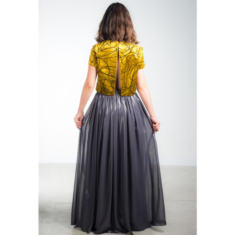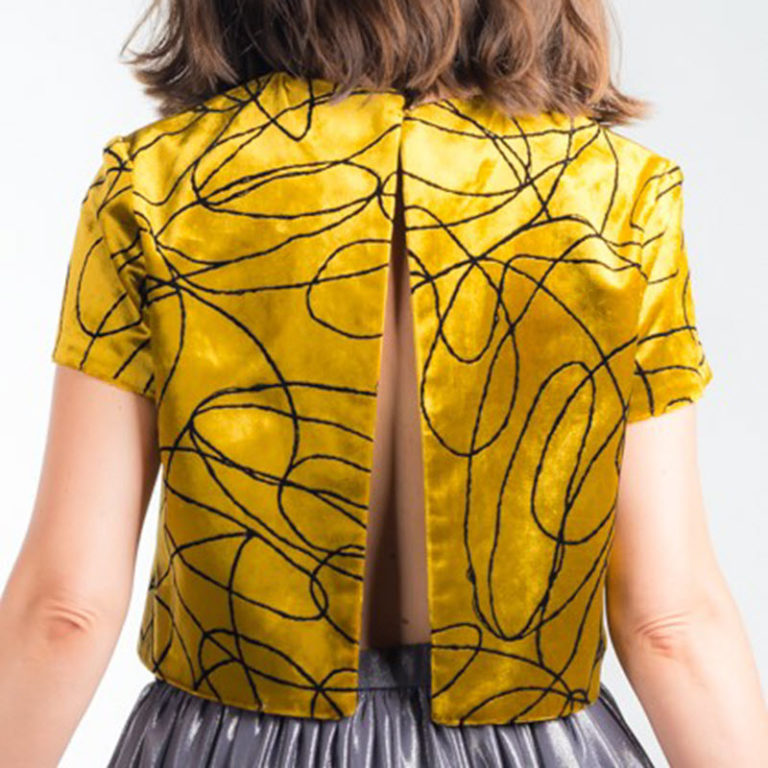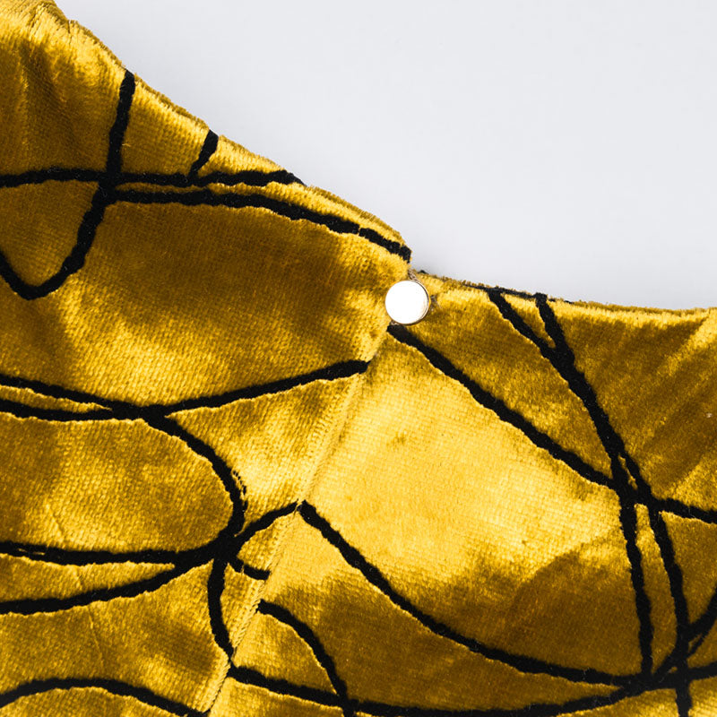 Top de terciopelo dorado, bordado con hilo negro. Cuello caja y manga corta. Detalle de abertura en espalda. Cierre posterior con botón metálico dorado.